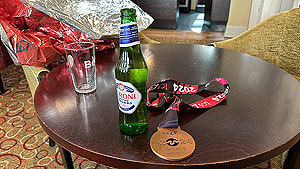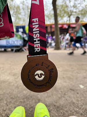 At the race end you get your medal then water and a foil blanket. The baggage lorries are not far away and service was very quick to retrieve the bag. The exit is crazy with people as families and friends try to meet up with runners. Make sure you agree on a meeting place before hand otherwise you will be one of the thousands trying to get a phone signal.